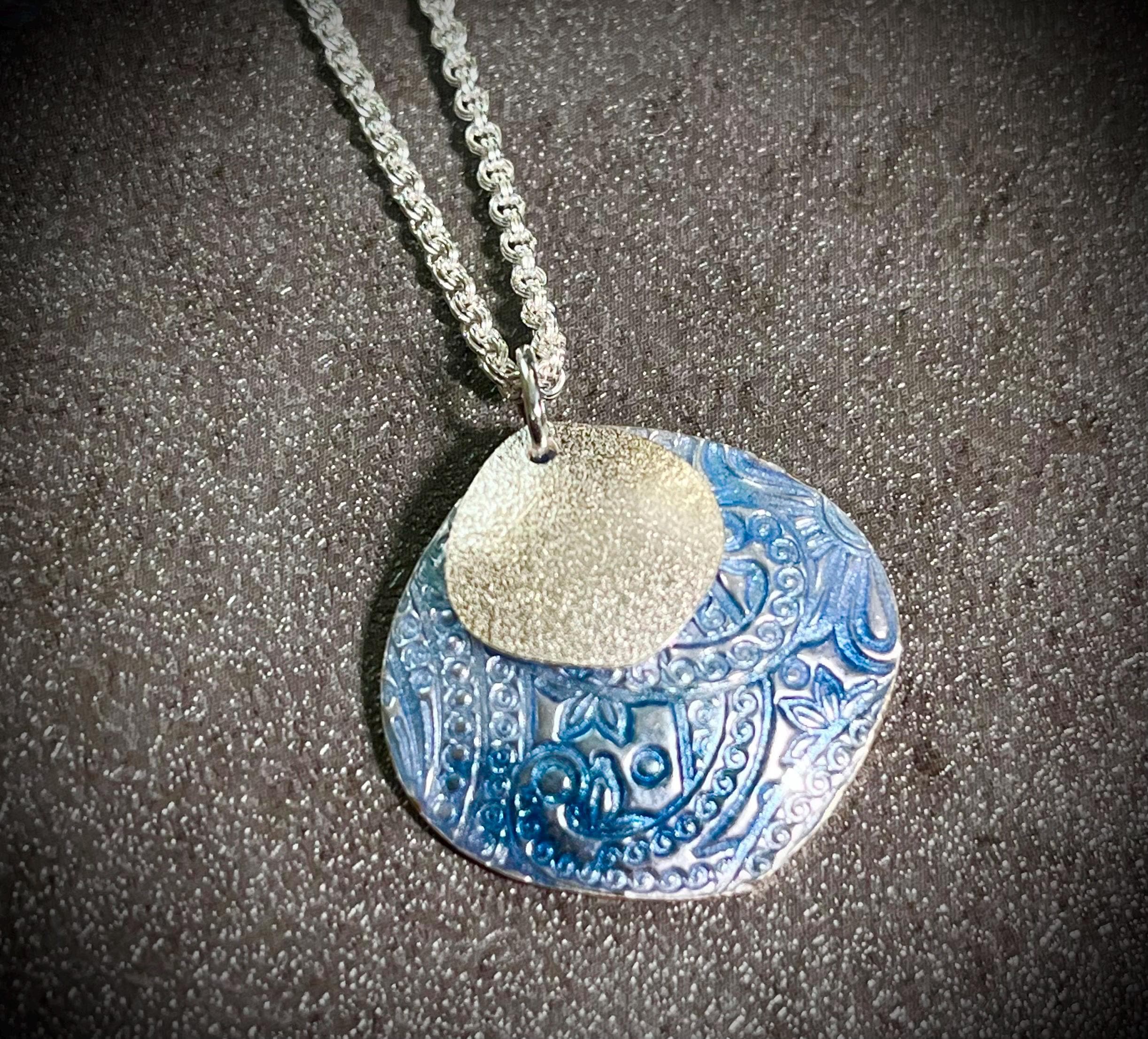 Textured silver and enamel Petal pendant, with sterling silver accent