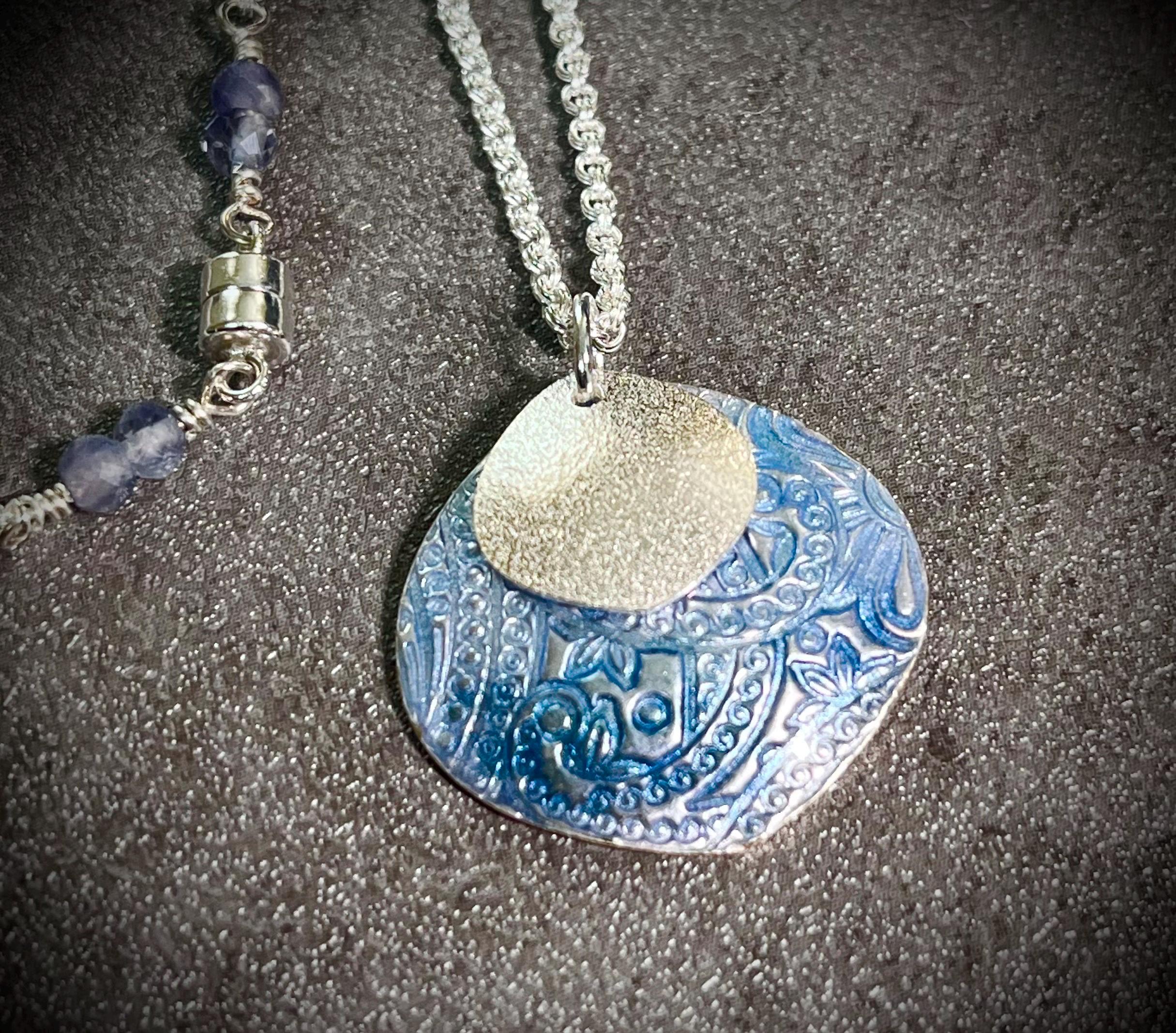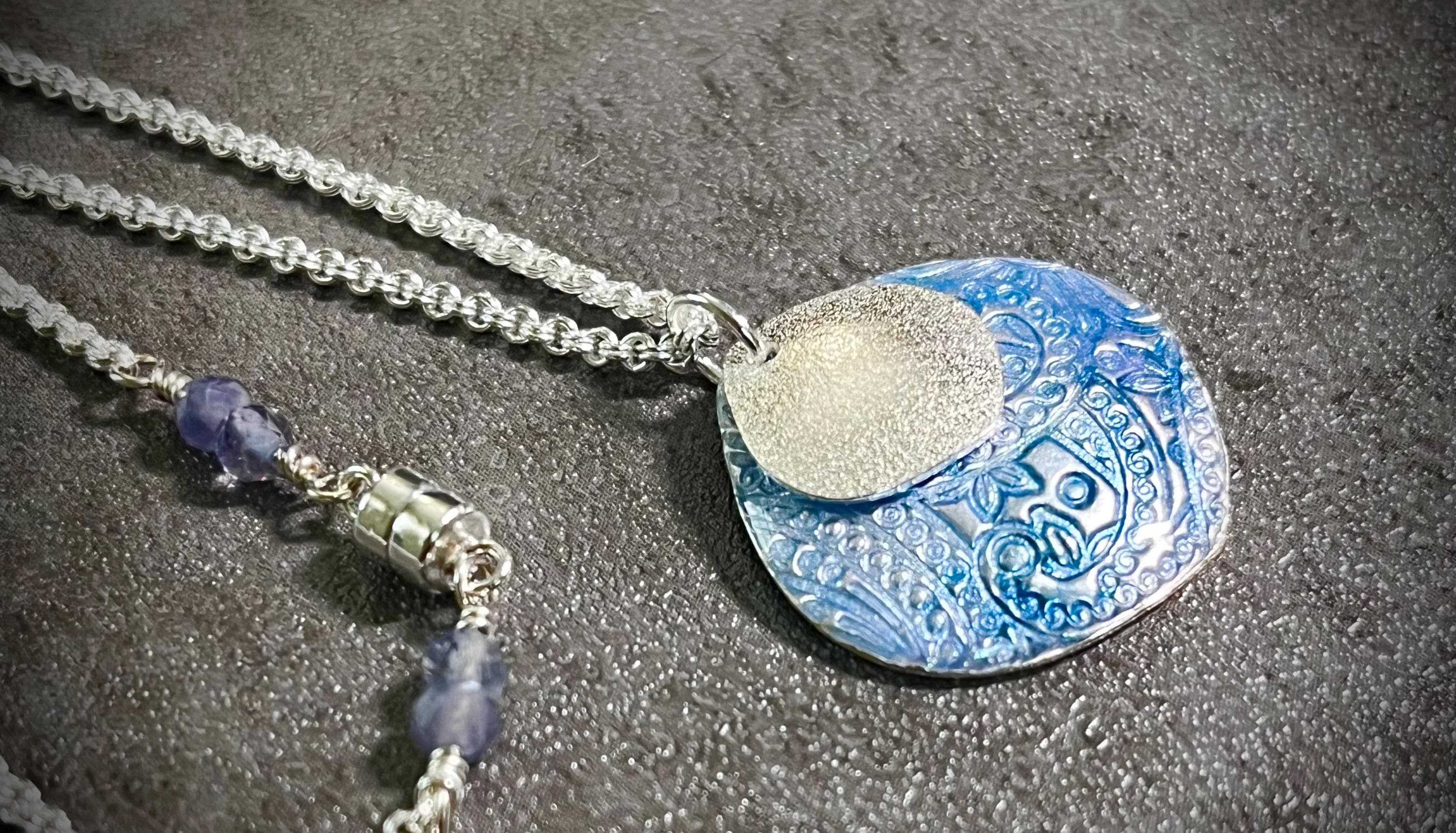 Textured fine silver and glass enamel pendant with a charming sterling accent. An everyday beauty can be paired with your favorite summer dress or t shirt and jeans. An 18 inch sterling chain and strong magnetic clasp adorned with gemstones completes this look.