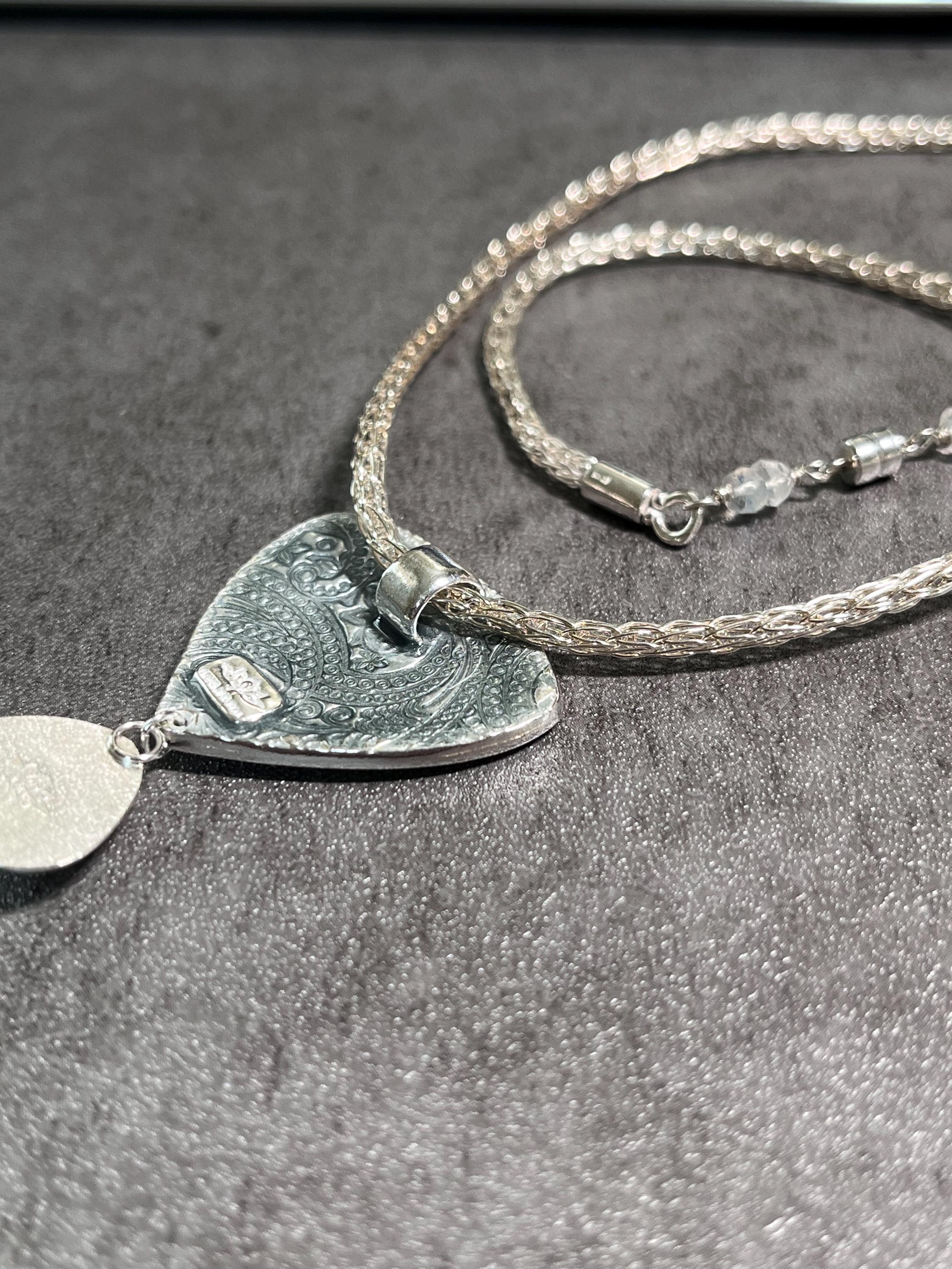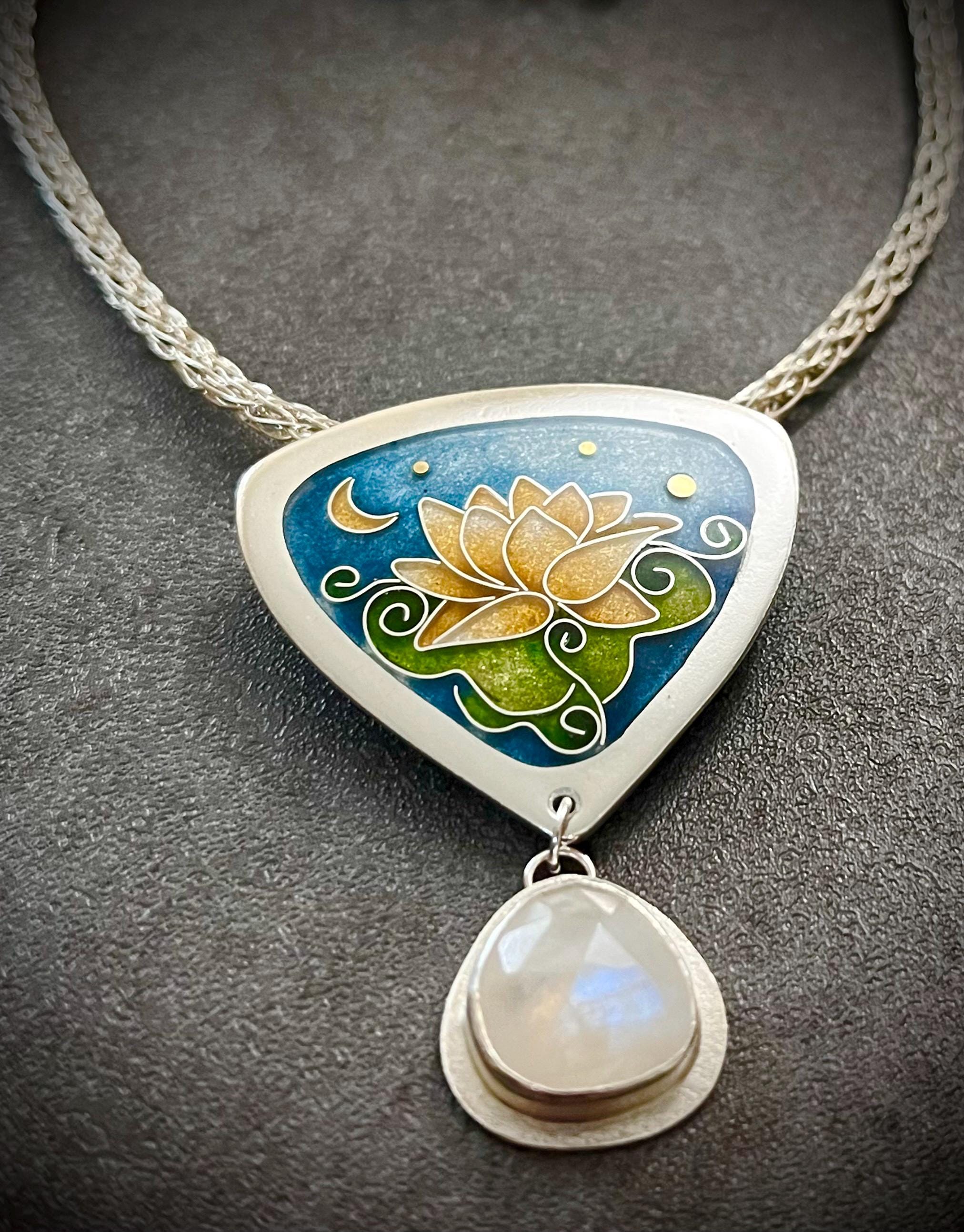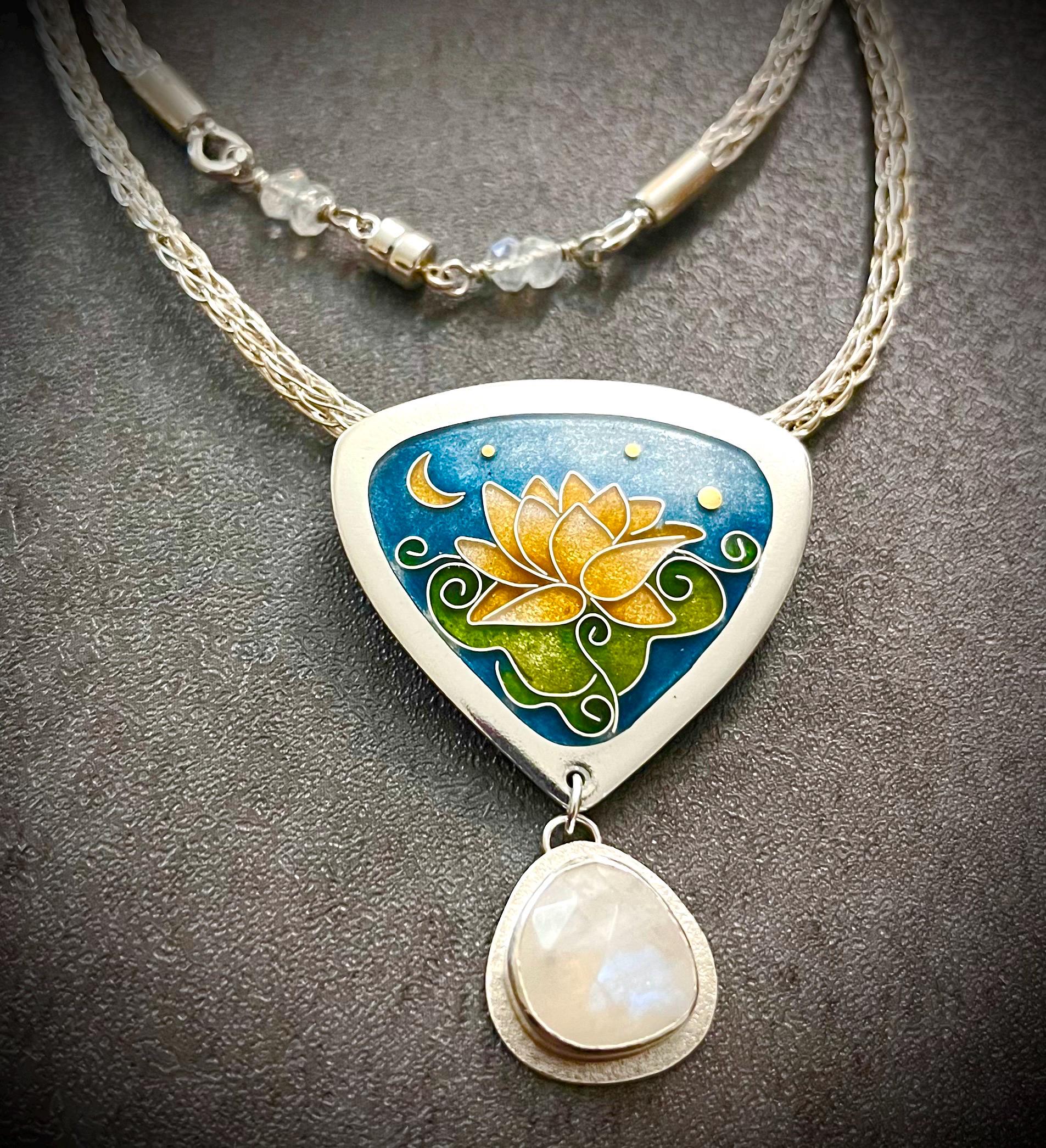 Fine silver and cloisonné enamel evening lotus necklace. Adorned by a beautiful rainbow moonstone and a handcrafted Viking knit sterling chain measuring 18 inches including a strong magnetic clasp accompanied by moonstone beads.
