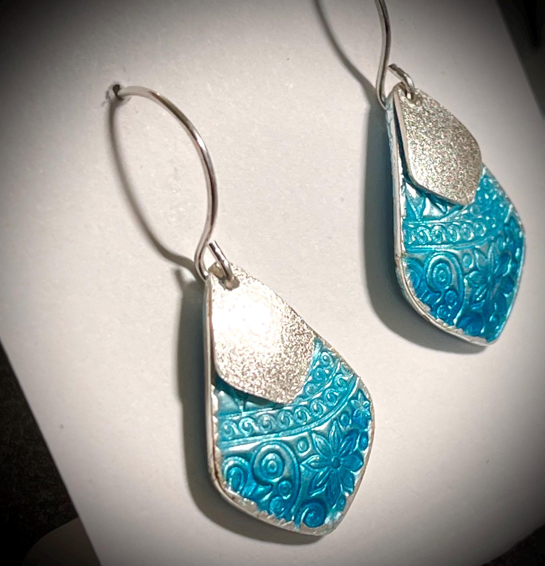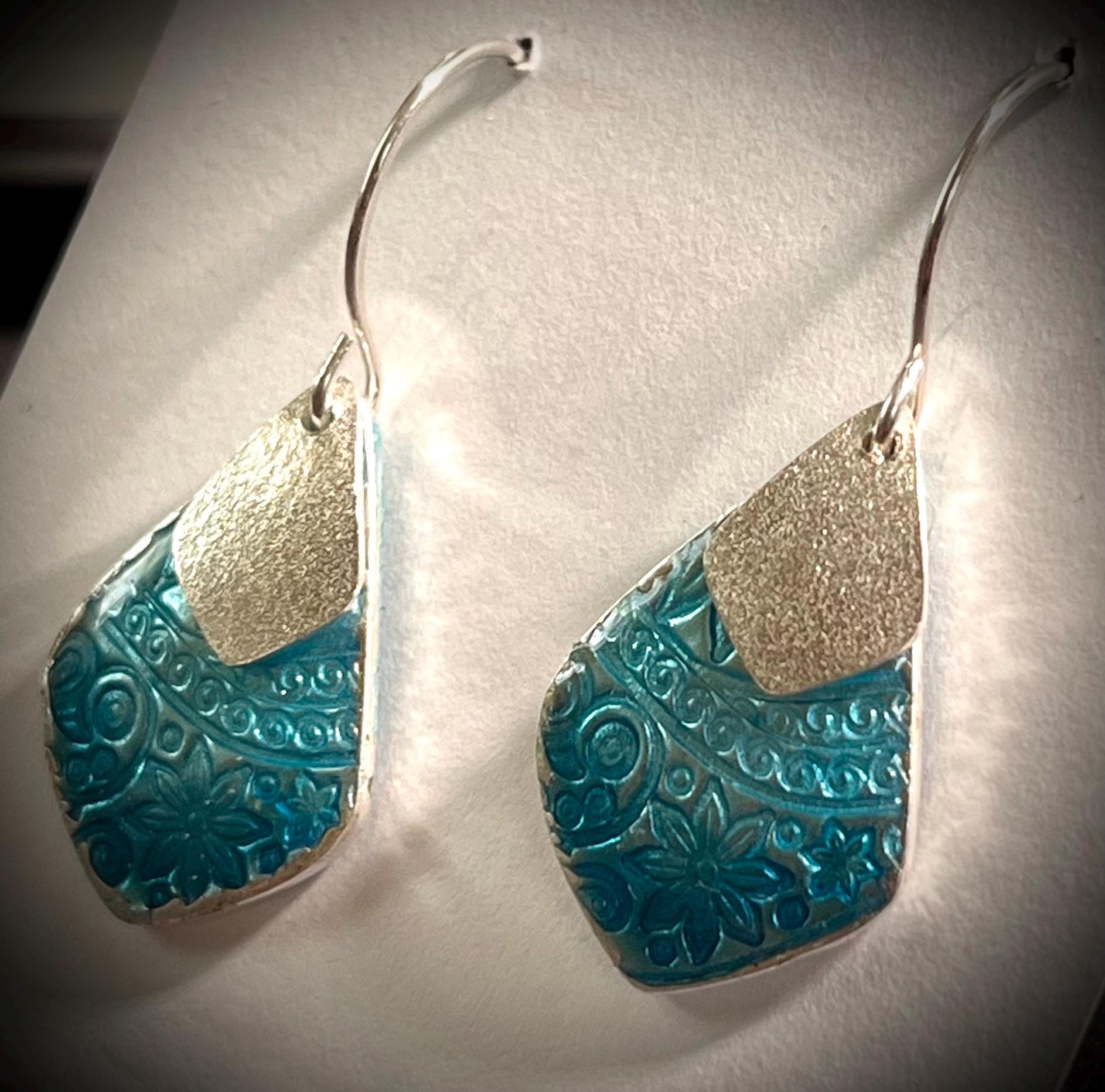 Fine silver and enamel earrings. Adorned with a sterling silver charm. Ear wires are handcrafted in sterling silver. Choose for your everyday look or add to your outfit for that special pop of color.